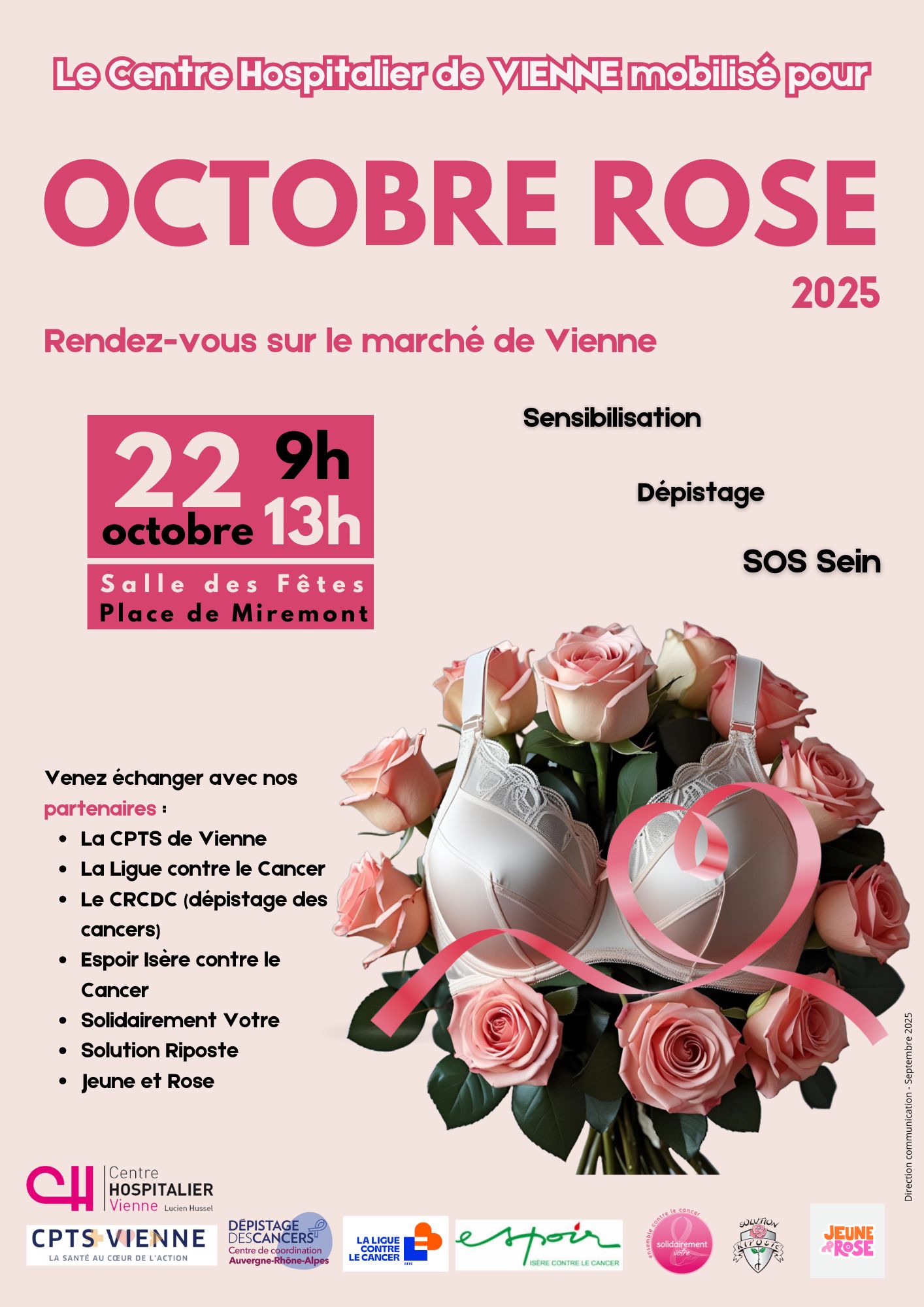 Venez vous renseigner sur le dépistage du cancer du sein entre 10h et 16h au Centre Hospitalier de Vienne Lucien HUSSEL. Nous sommes tous concernés !!