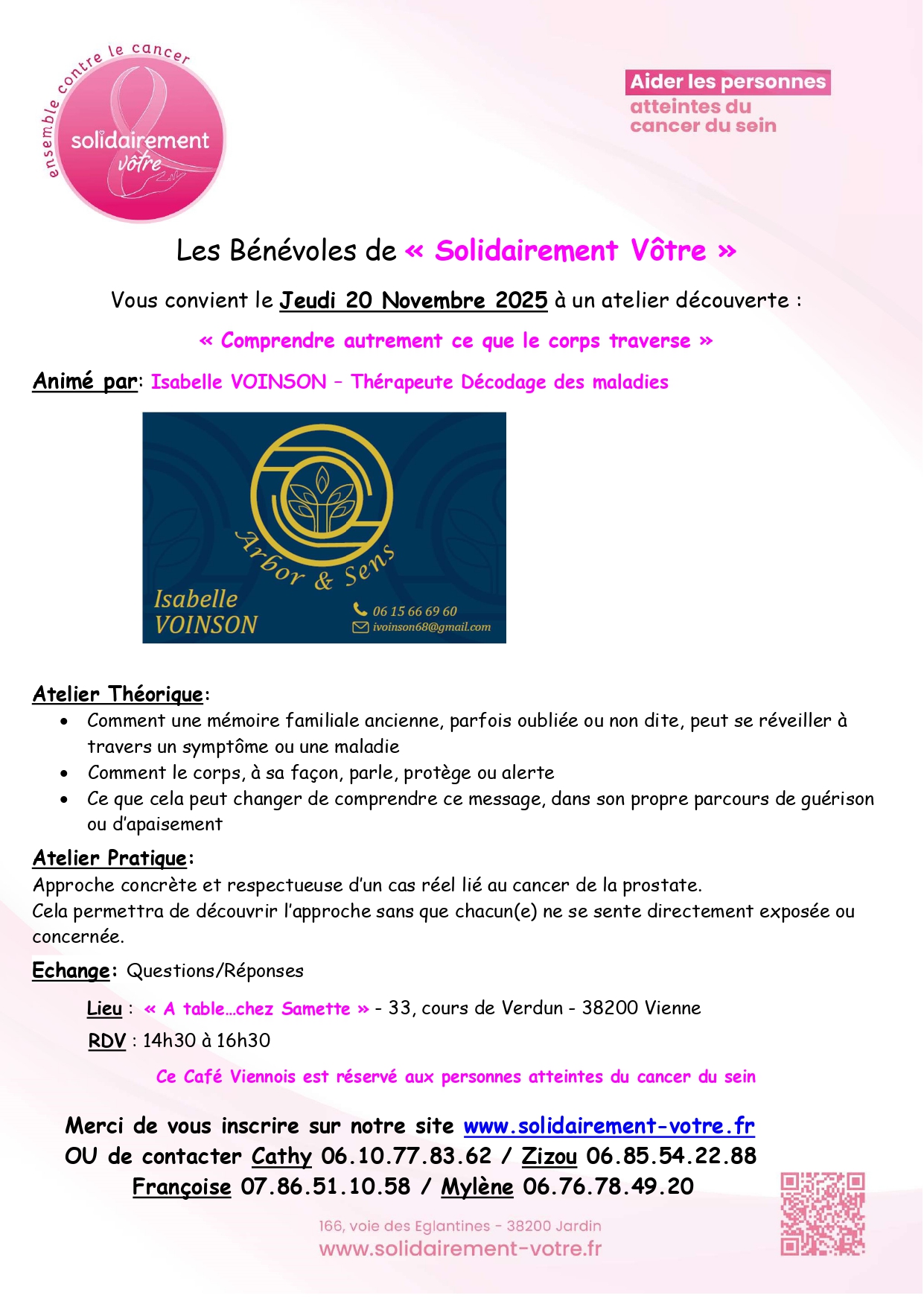 RDV le jeudi 20/11/2025 pour un café viennois autour d'un atelier découverte « Comprendre autrement ce que le corps traverse » animé par Isabelle VOINSON - Thérapeute Décodage des maladies